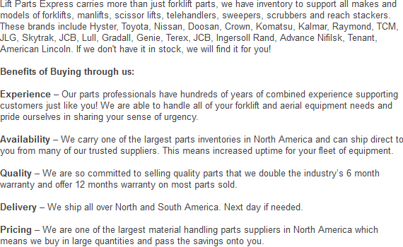 We have great prices on all our lift-truck parts. For a price quote on a part or attachment we offer, please contact us at: